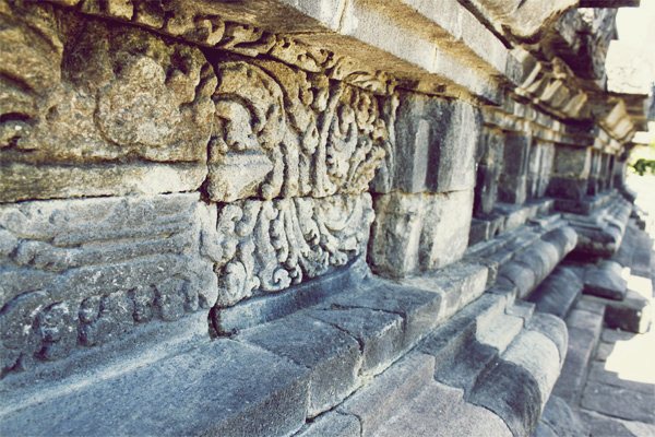Matahari bersinar di atas kepala. Cahayanya membentuk guratan-guratan di sepanjang tembok. Suara burung yang bertengger terdengar riuh. Hamparan sawah dan ladang membentang. Bau rumput tercium lembut, terbang bersama angin kering. Sebuah candi menjulang, menunjukkan keanggunan diantara senyap yang merayap.