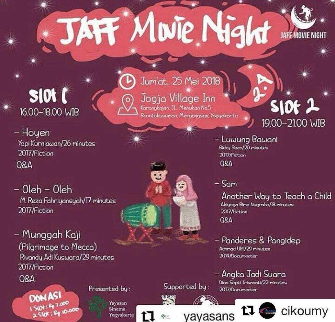 Jaff Movie Night 2018 (2) | Jumat, 25 Mei 2018 | Jogja Village Inn | Slot I : 16.00 - 18.00 WIB | Slot II : 19.00 - 21.00 WIB