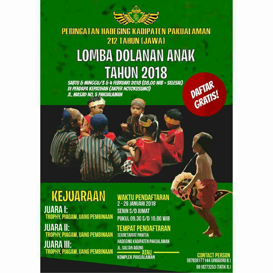 Lomba Dolanan anak 2018, dalam rangka peringatan hadeging kadipaten pakualaman | Sabtu & Minggu, 03-04 Februari 2018 | Pendapa Kepatihan , Jalan Masjid No.5 Pakualaman