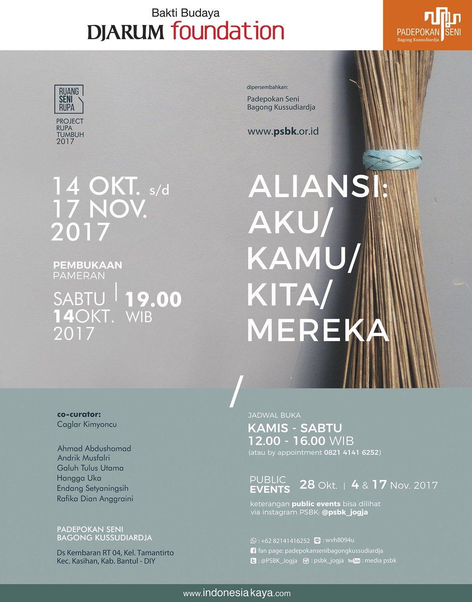 Pameran ALIANSI : "aku/kamu/kita/mereka" | Pembukaan pameran, 14 Oktober 2017, Pukul : 19.00 WIB | Jadwal Buka : Kamis- Sabtu, Pukul : 12.00 - 16.00 WIB | Pameran berlangsung 14 okt-17 nov 2017 | Di Padepokan Seni Bagong Kusudiardja