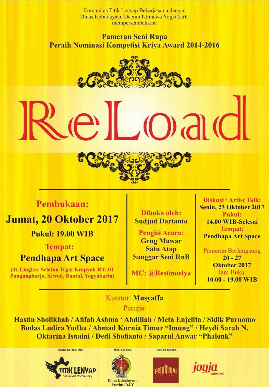 Pameran seni rupa "Reload" | Pembukaan pameran : 20 Oktober 2017 | Pameran berlangsung : 20-27 Oktober 2017 | Pendhapa Art Space, Jalan Lingkar Selatan Tegal Krapyak Panggungharjo Sewon Bantul