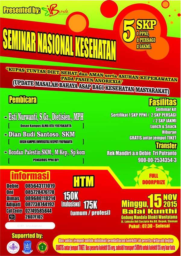 15/11/15 | Seminar Nasional Kesehatan | Balai Kunthi | 150K for Mhs, 175 for Pro | CP: 085643171019 (Debie)