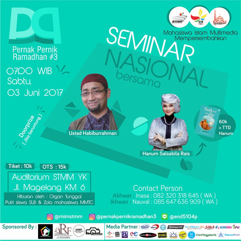 Mahasiswa Islam Multimedia mempersembahkan Seminar Nasional bersama Ustad Habiburrohman dan Hanum Rais | Sabtu,03 Juni 2017 | Pukul.07.00 WIB | Auditorium STMM Yk jalan Magelang Km.06 Yogyakarta
