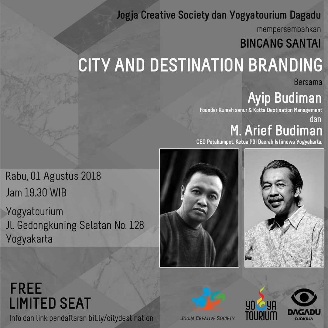 Bincang Santai "City and Destination Branding" | bersama Ayip Budiman dan M. Arief Budiman | Rabu, 01 Agustus 2018 | Pukul: 19.30 WIB | Yogyatourium, Jln Gedongkuning Selatan No.128 Yogyakarta