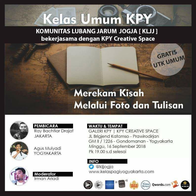 Kelas Umum KPY "Merekam Kisah Melalui Foto dan Tulisan" | Minggu, 16 September 2018 | Pukul: 19.00 WIB | Creative Space KPY, Jalan Brigjend Katamso GM II/1226 Yogyakarta